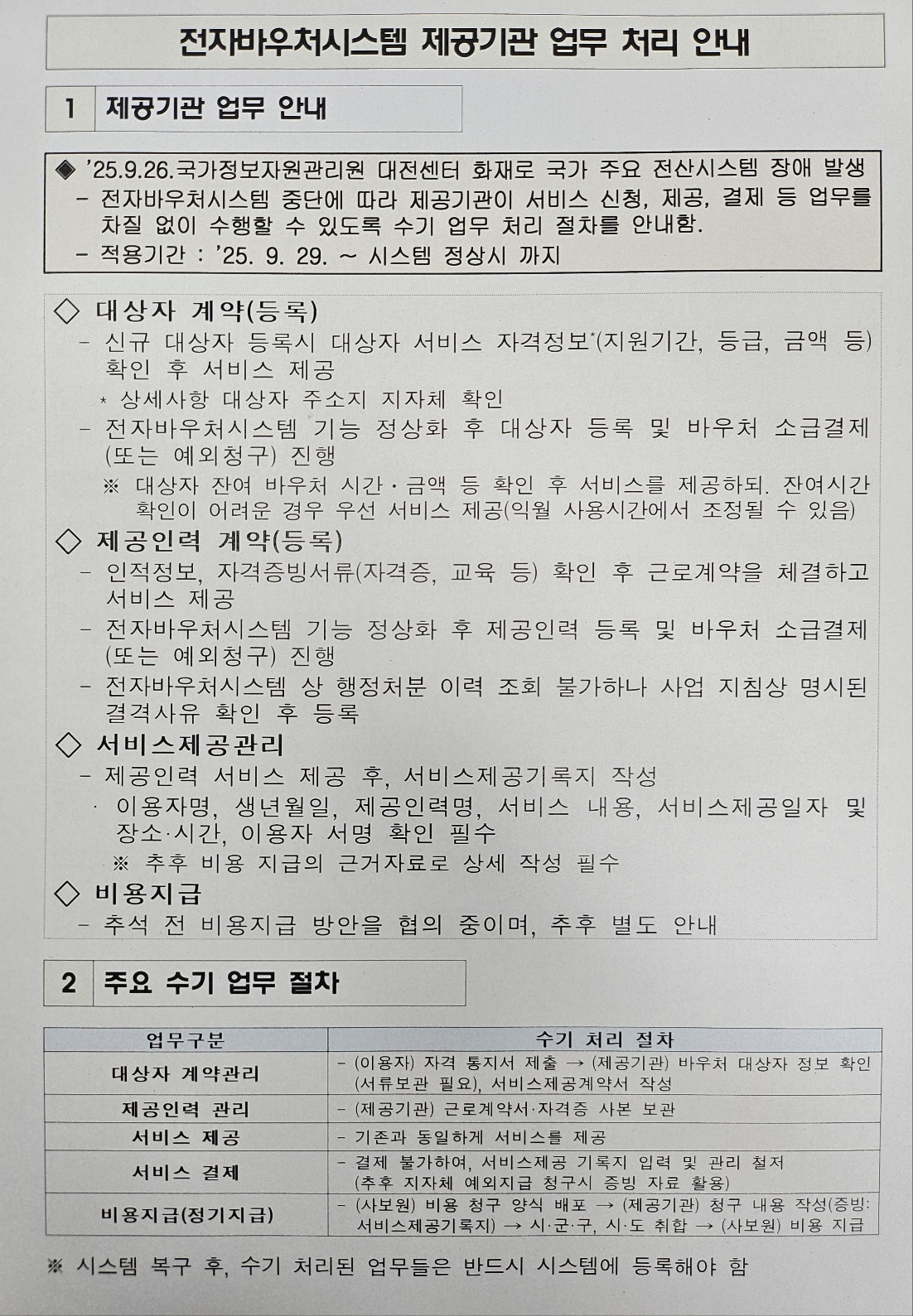 [복지부 공유]전자바우처 시스템 장애에 따른 지역자율형 사회서비스 투자사업 업무처리 안내_제공기관용.hwp (size:157,696 Byte)