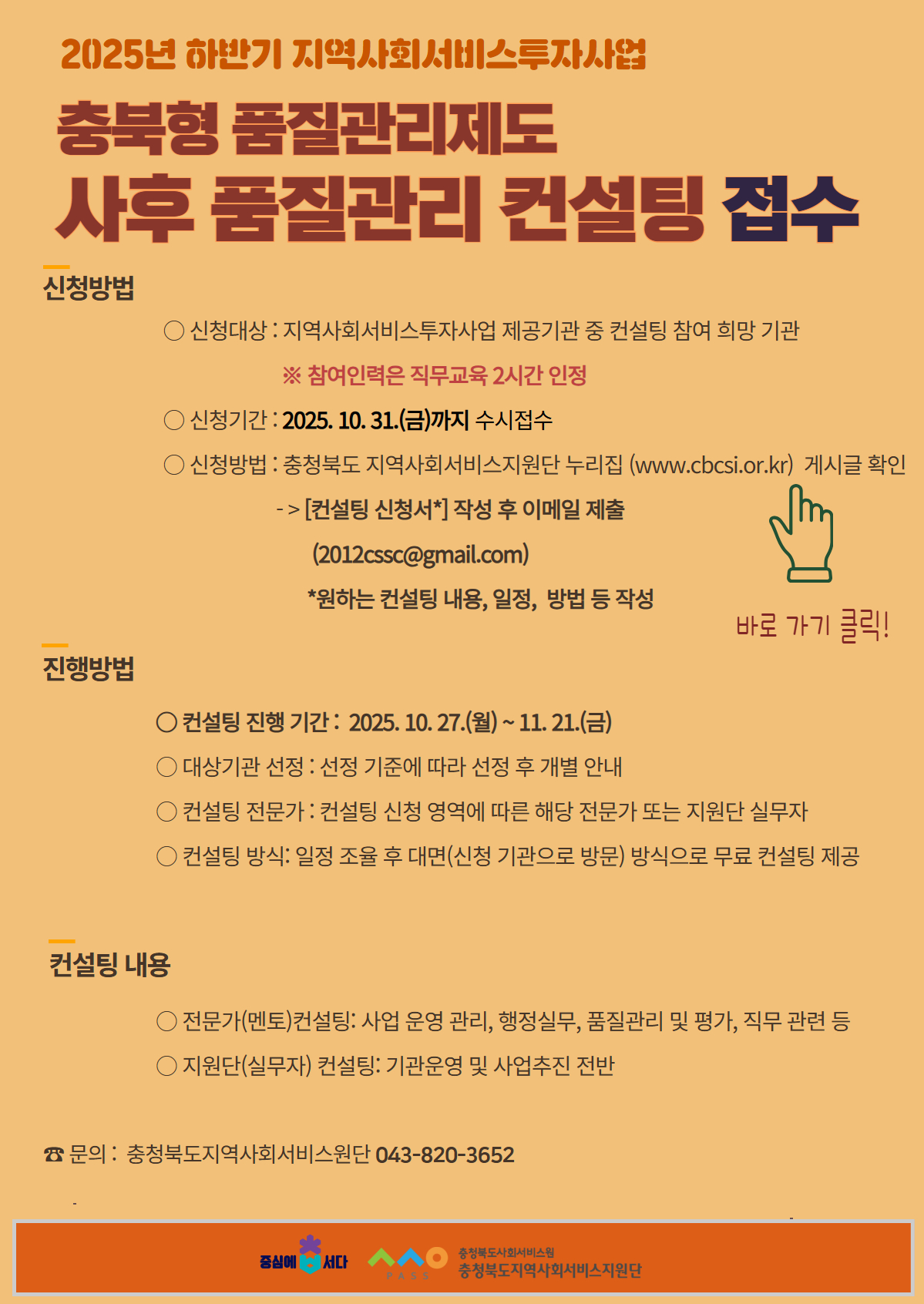 충청북도 지역사회서비스지원단 제공기관의 지원 및 정보를 제공합니다.